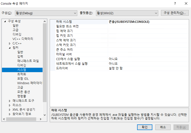 링커 -> 시스템 -> 하위시스템란이 콘솔로 설정되어 있을 것이다.