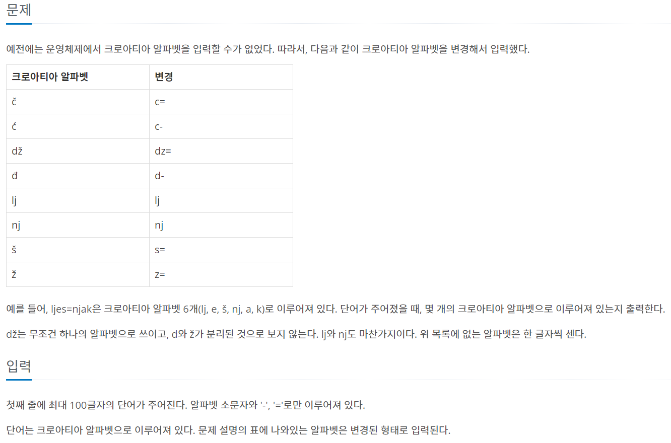 최대 100글자의 문자열을 입력받고, 크로아티아 알파벳에 해당하는 문자들은 문자 1개로 계산하여 총 알파벳의 갯수를 세는 프로그램을 작성하는 문제이다.