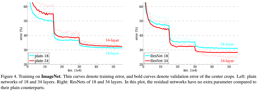 - 실험 결과, 위와 같이, 기존 VGG-Like 아키텍쳐로 18레이어와 34레이어를 쌓았을 때는 오히려 plain-34에서 정확도가 낮아지는 경향성을 보였다.