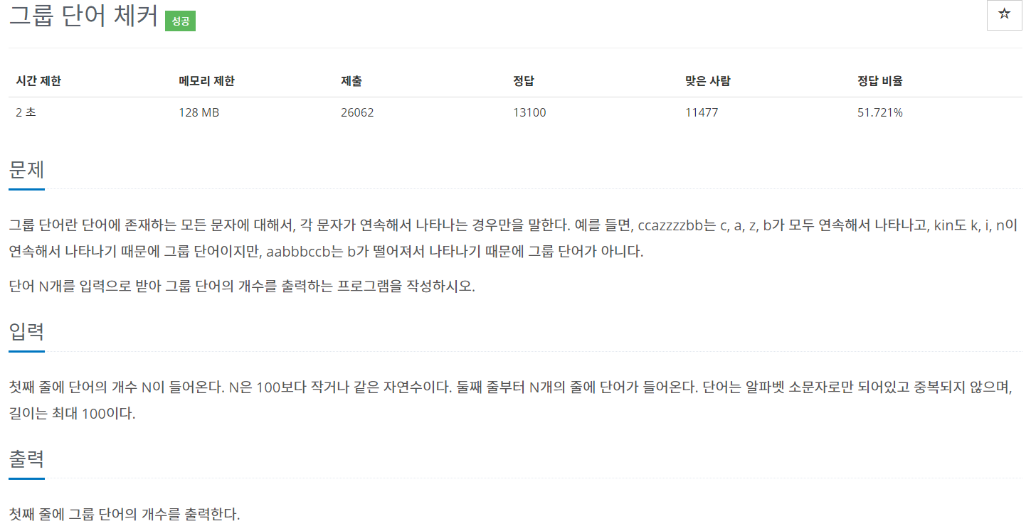 임의의 문자열을 입력받은후, 알파벳의 연속 유무를 따져 그룹 단어인지 아닌지를 판별하는 프로그램을 작성하는 문제이다.