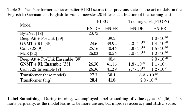 - Attention 방식과 효율적인 병렬 연산을 통해 계산량을 크게 감소시켰으며, 학습시간을 단축하면서 정확도는 기존 SOTA를 뛰어넘는 결과를 얻어냈다. (심지어 여태까지 발표된 모든 방식을 Ensemble한 것 보다도 높은 성능이다.)