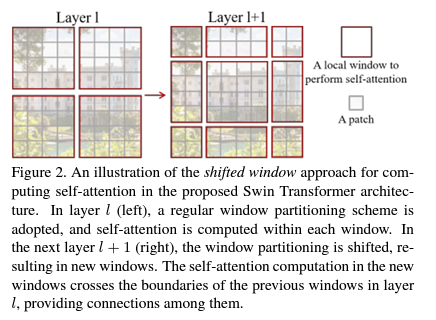 - 하지만 W-MSA만을 이용할 경우, Window간의 연관관계를 파악할 수 없고 이로 인해 이미지 전체를 인식하는데 어려움이 발생한다. 저자들은 Window간의 Connection을 학습하면서, 연산량의 효율성은 그대로 유지하기 위해서 Shifted Window MSA를 제안한다.