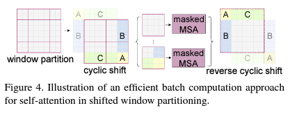 - 따라서 본 논문에서는 위 그림과 같이 Cyclic Shift를 진행한 뒤, 실제로는 이웃하지 않은 Patch인 A,B,C에 대해서는 Mask를 통해 Attention을 계산하지 않도록 구현한다.