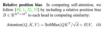 - Swin Transformer는 ViT와 달리 Positional Embedding을 입력부분에서 추가하지 않고 Relative Position Bias를 활용한다.