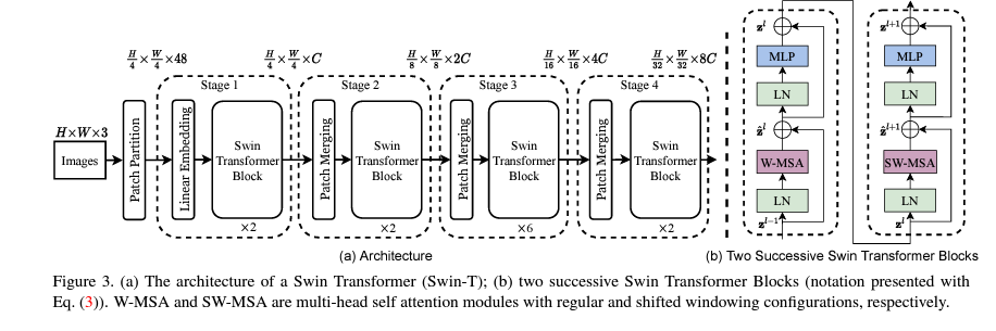 - Patch Partition, Linear Embedding, Swin Transformer Block, Patch Merging으로 구성되어 있다.