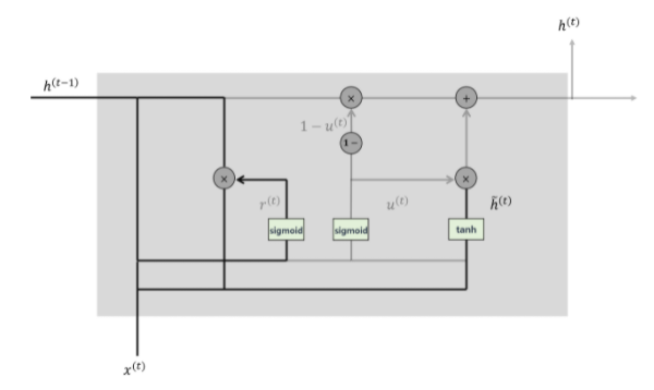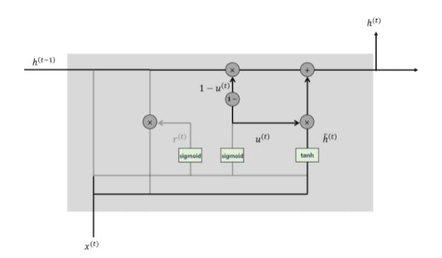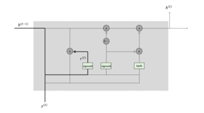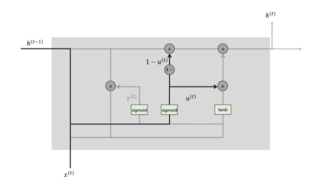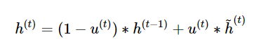 - 그 후, 임시h(t)와 update gate의 결과값을 적절히 합쳐서 최종 hidden state h(t)를 계산한다. 그림으로 확인하면 다음 프로세스에 해당한다.