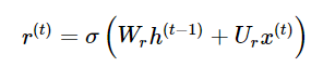 - 과거의 hidden state 값을 적절히 버려주는 역할을 하는 Gate로 직전 시점의 hidden state와 현시점의 입력값에 W를 곱해서 얻어지며, LSTM과 같이 Sigmoid함수를 통해 0~1 사이의 값을 지니게끔 한다.