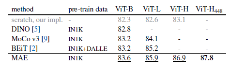 - 이러한 두가지 설계를 합쳐서 구현한 MAE는 3배 이상의 속도 향상을 이뤄냈고, (인코더의 입력 차원이 줄었으므로), 정확도 또한 ImageNet 1K 데이터만으로 ViT-Huge에서 87.8%의 정확도를 얻어냈으며, 이는 기존 Supervised Learning 방식의 정확도보다 높다.
