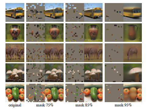 - 반면, 이미지의 경우, 공간적 특성을 매우 크게 담고 있는 일종의 자연 신호이다. 따라서, 특정 patch가 지워진다고 하더라도 주변의 patch를 통해 손쉽게 복원이 가능하며, 그다지 높은 수준의 이미지 이해 능력이 없더라도 쉽게 수행될 수 있다.