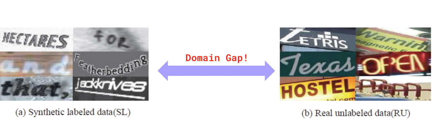 - 본 연구는 Synthetic Data를 사용하여 Supervised Learning을 하는 동시에, 다수의 Unlabeled Real Data를 활용하여 STR의 정확도를 향상시키는 방법을 다룬다.