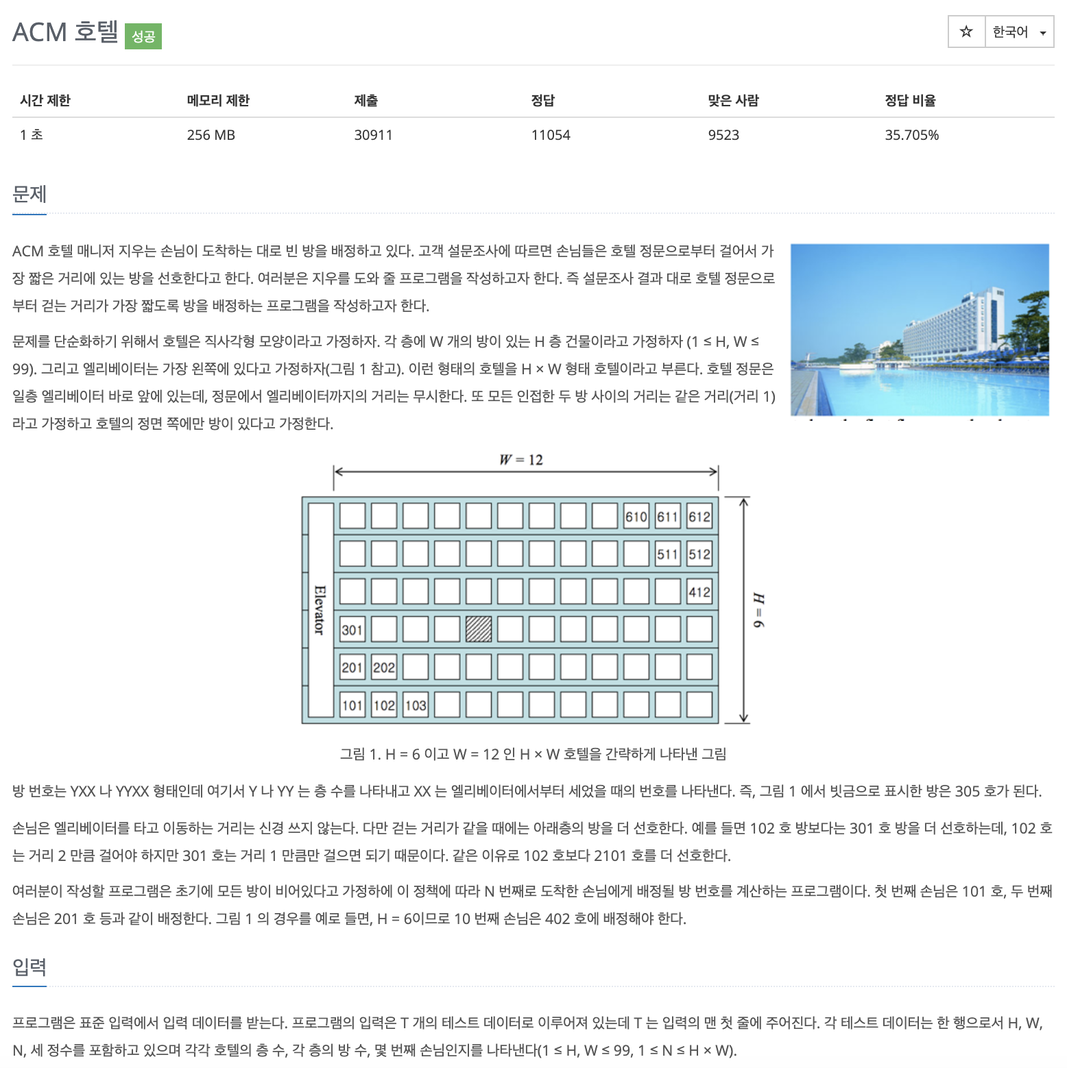 높이가 H, 호수가 W개 만큼 있는 호텔에서 손님에게 방을 배정하려고 한다. 손님들은 엘레베이터에서 가까운 호실을 선호하고, 거리가 같다면 더 밑 층을 선호한다. 이 때, N번째의 손님이 배정받는 방 번호를 구하는 프로그램을 작성하는 문제이다.