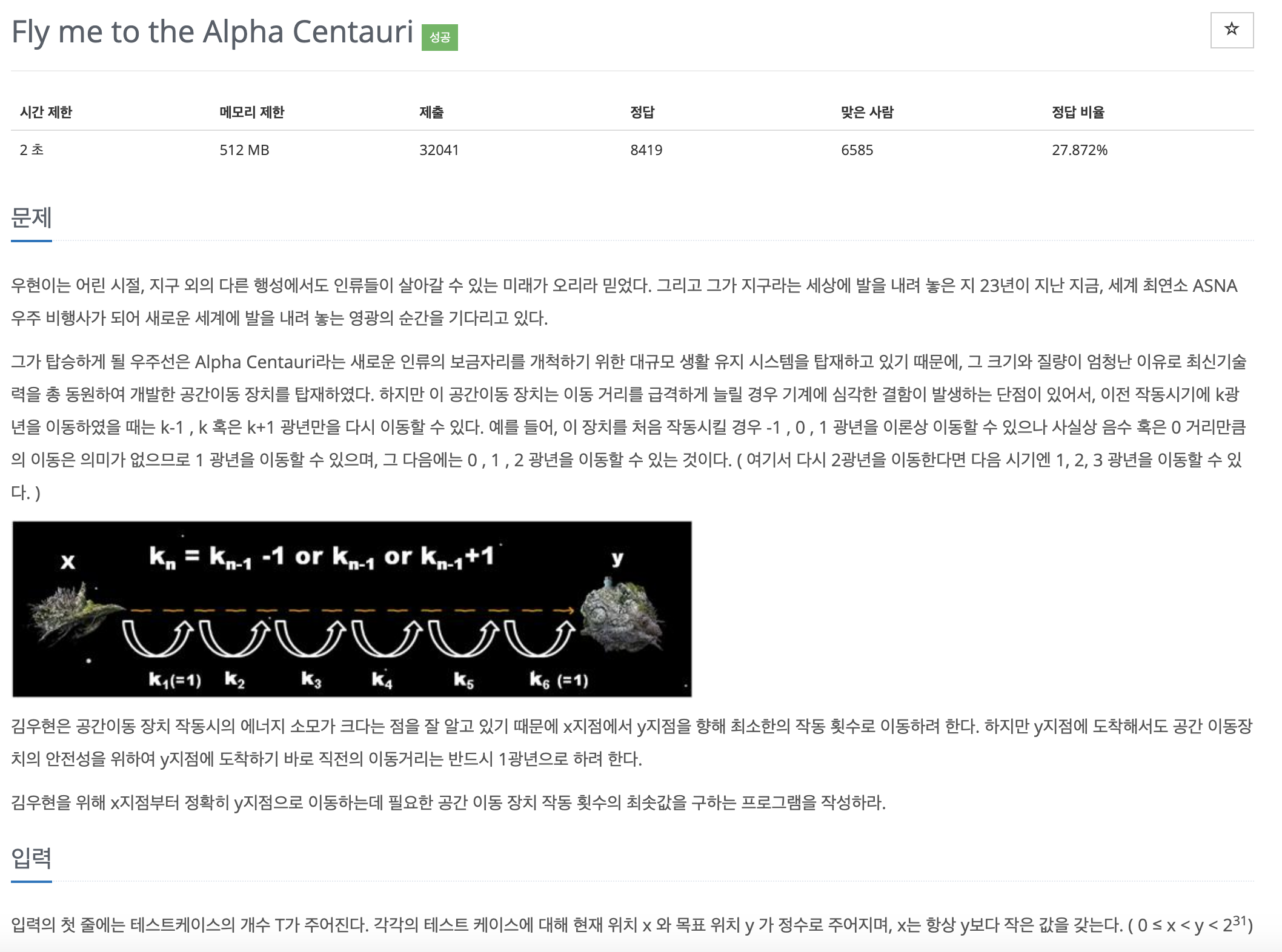 예를 들어 위의 경우에는 입력값이 13광년이었을 때, (3 X 3) + 4의 형식으로 표현이 가능하고, 이에 위 공식을 대입하면 처음 9광년을 이동하기 위해 (2 x 3 - 1), 즉 5번의 이동 횟수가 필요하고, 나머지 거리 (4 / 3) = 1.333이므로 올림값을 2만큼의 이동 횟수가 필요하다는 것이다.