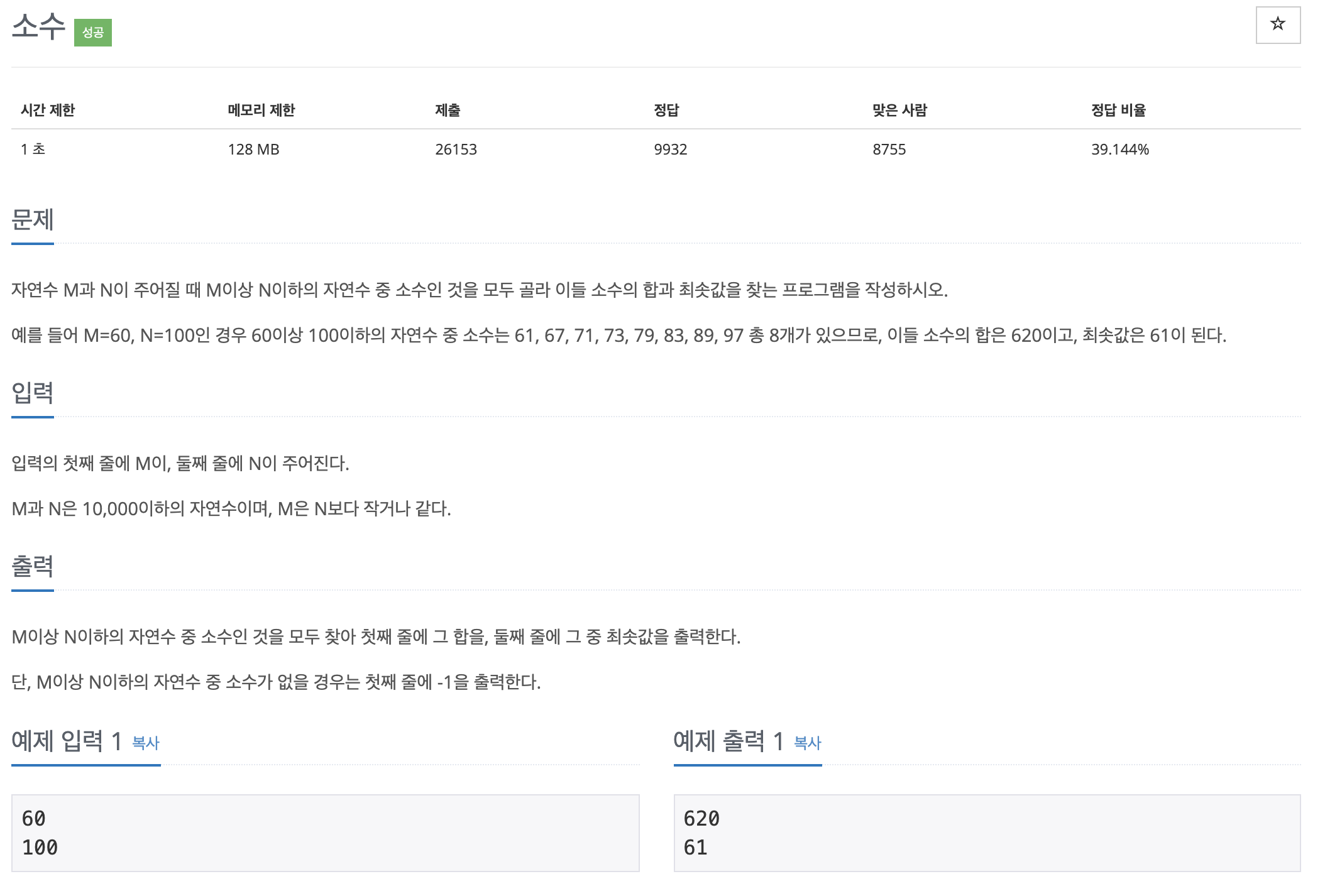 숫자 M과 N을 받아서, M이상 N 이하의 자연수 중 소수인 것을 모두 찾아 첫째 줄에는 그 합을, 둘째 줄에는 최솟값을 출력하는 프로그램을 작성하는 문제이다. 이 때 소수가 없는 경우엔 -1을 출력한다.