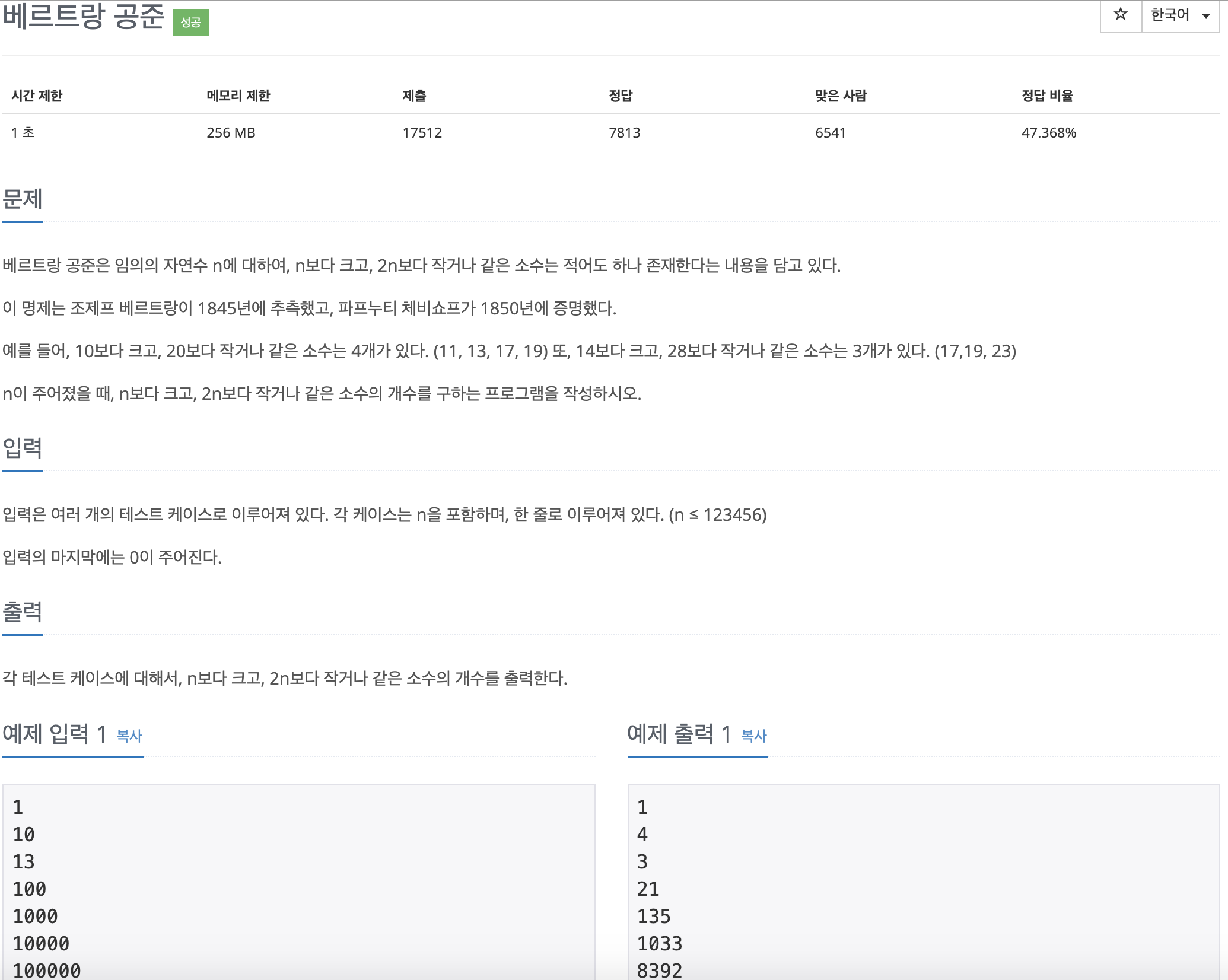 베르트랑 공준은 임의의 자연수 n에 대하여, n보다 크고, 2n보다 작거나 같은 소수는 적어도 하나 존재한다는 내용의 명제이다. 임의의 숫자 n이 주어졌을 때, n보다 크고, 2n보다 작거나 같은 소수의 개수를 구하는 프로그램을 작성하는 문제이다.