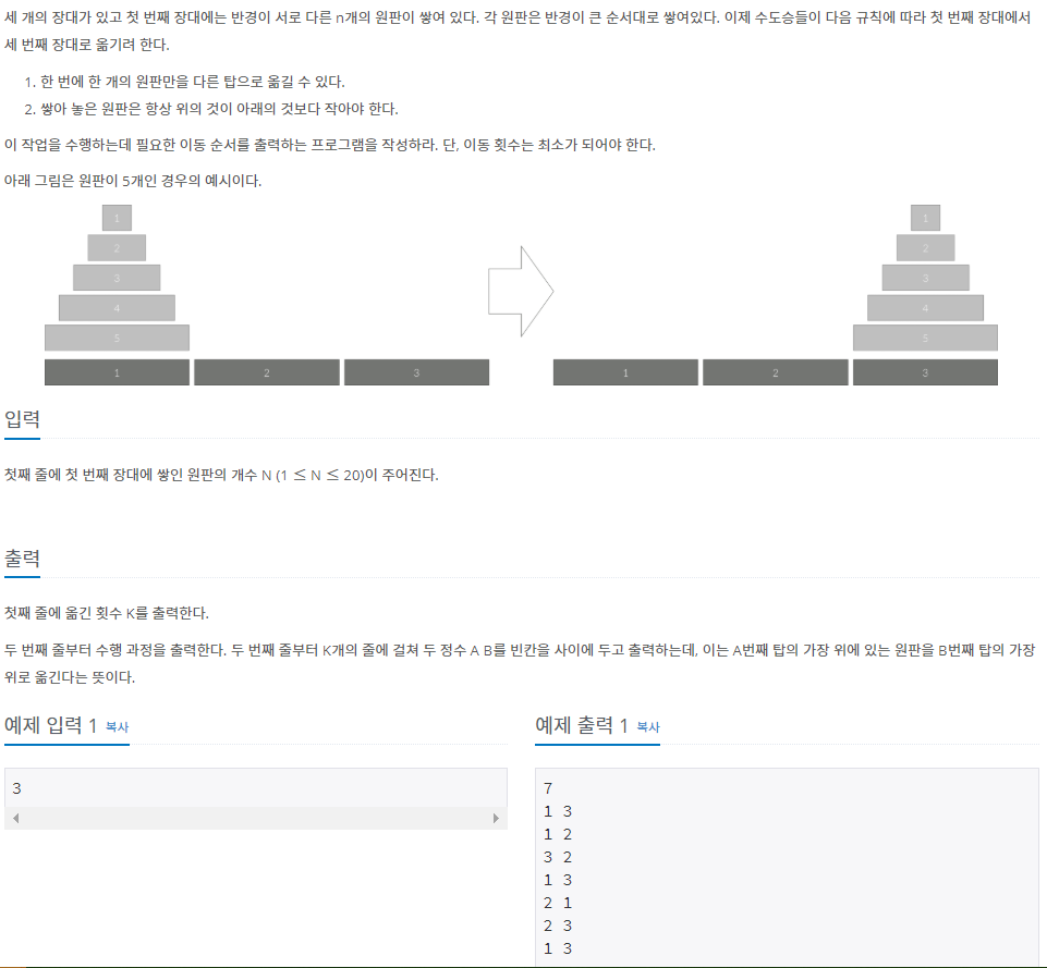 하노이의 탑 문제이다. 1번 장대에 순서대로 쌓여있는 N개의 원판을 어떻게 해야 최소한의 이동을 통해 3번 장대로 모두 이동시킬 수 있는지 최소 횟수와 수행 과정을 출력하는 문제이다.
