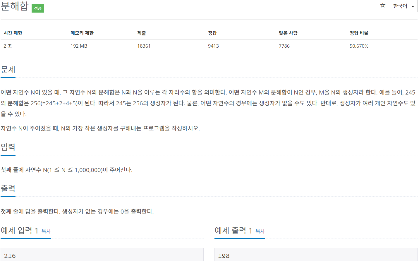 어떤 자연수 N이 주어졌을 때, N의 가장 작은 생성자를 구해내는 프로그램을 작성하는 문제이다.
