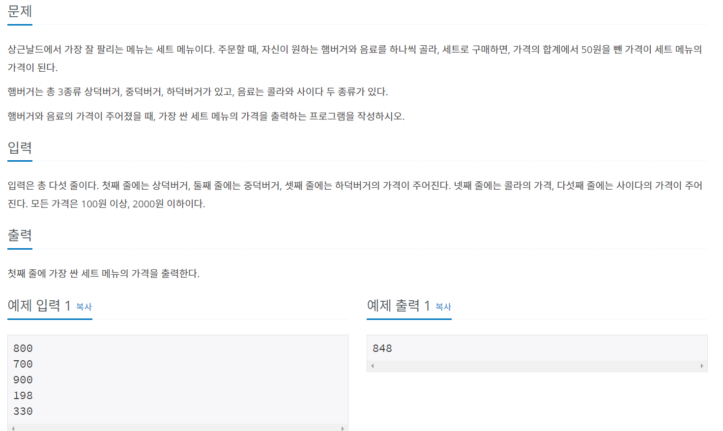 if문으로 가장 싼 버거와 가장 싼 음료를 선택한 후 합친값에서 50을 빼주면 되는 문제이다.