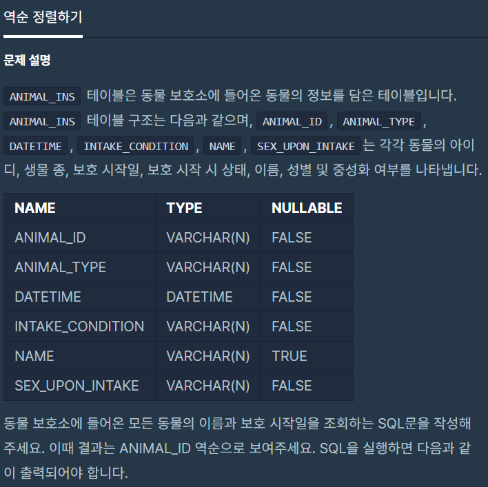 SELECT NAME, DATETIME FROM ANIMAL_INS ORDER BY ANIMAL_ID DESC