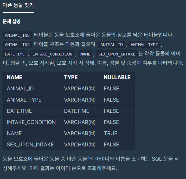 SELECT ANIMAL_ID, NAME FROM ANIMAL_INS WHERE INTAKE_CONDITION = 'Sick' ORDER BY ANIMAL_ID;