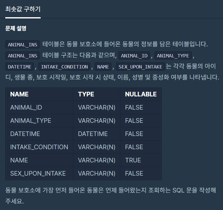 동물 보호소에 가장 먼저 들어온 동물은 DATATIME값이 가장 적은 동물이므로 MIN을 통해 풀이가 가능하다.