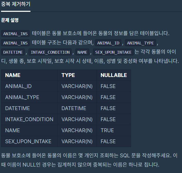 이 때 중복을 제거하기 위해서 DISTINCT 구문을 사용하여 중복을 1개로 세게끔 할 수 있으며, NAME이 NULL이면 집계하지 않아야하므로 WHERE NAME IS NOT NULL; 조건을 넣어 풀이하여야 한다.