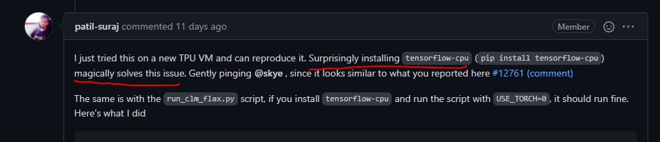 TPU-VM 자체가 내부적으로 Tensorflow를 사용해서 그런지, tensorflow-cpu를 설치하는 순간 에러가 사라졌다!